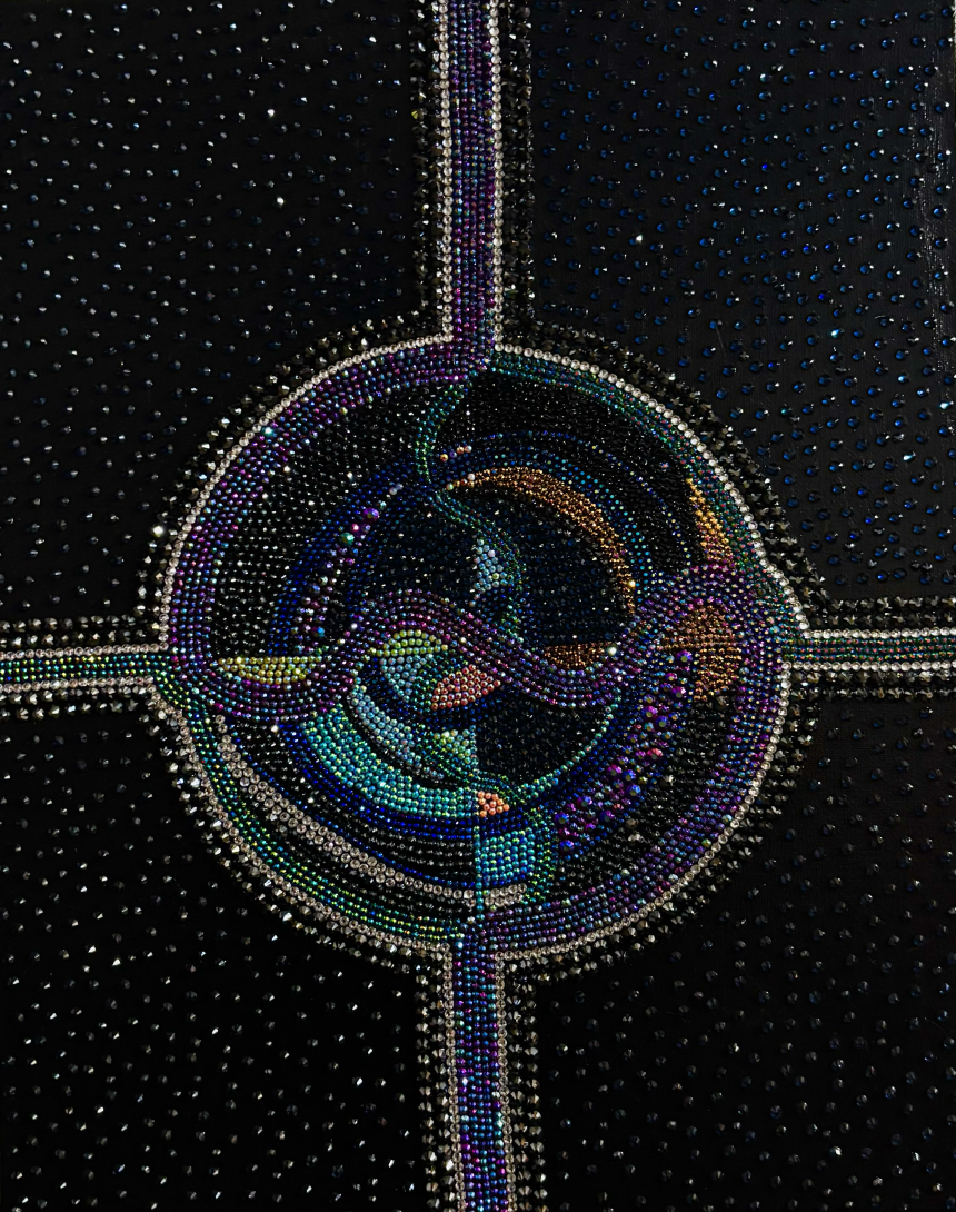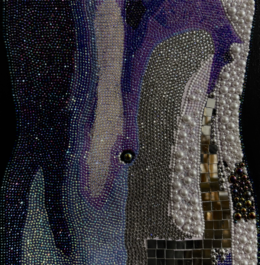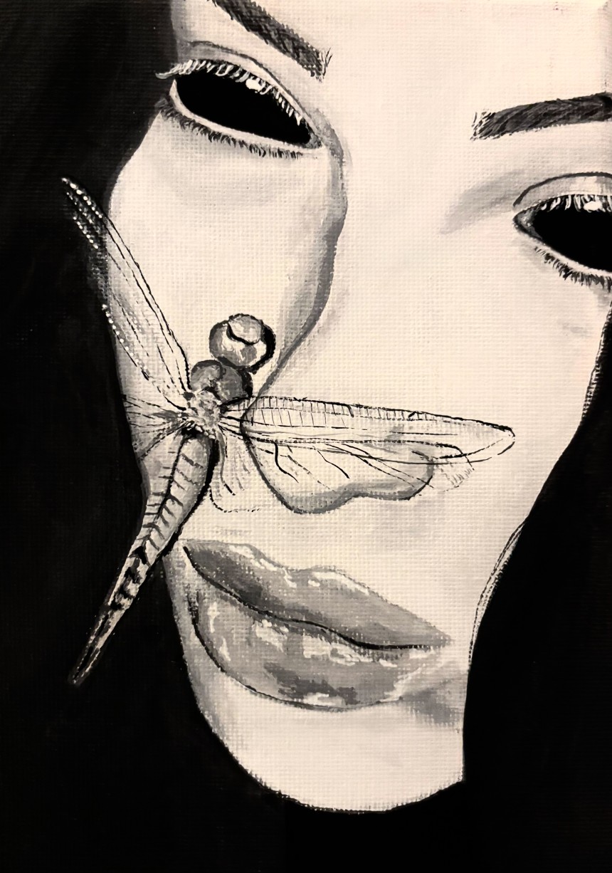 The face’s exaggerated features, particularly the lips and eyes, add a sense of disorientation, commenting on altered states of...