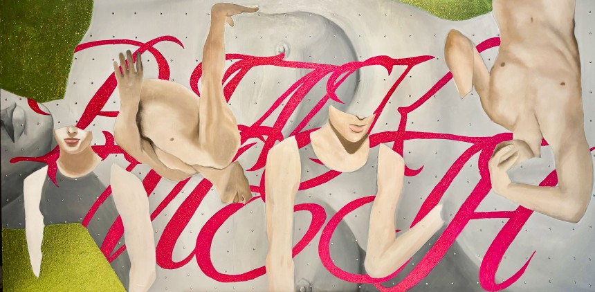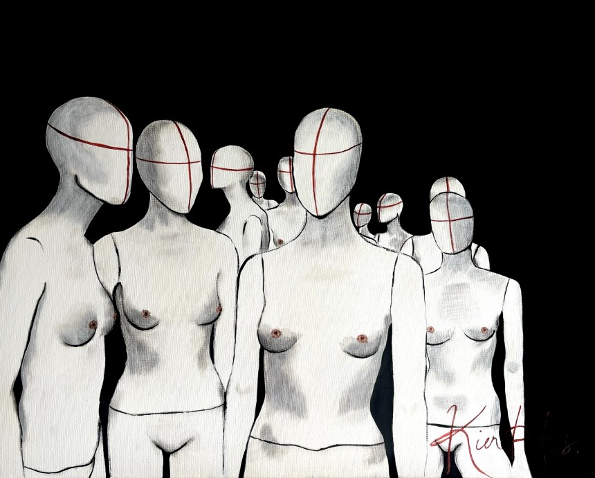 'Fragmented' features a portrait of a woman, layered with collage-style newspaper clippings, reinforcing themes of fragmented identity and...